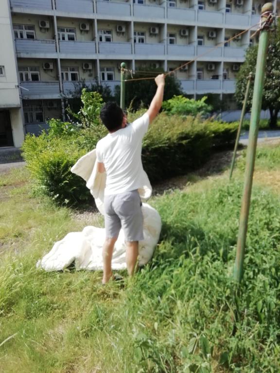 辅导员李亚飞和宿舍管理员王连华首先统一打开宿舍门和阳台的门窗进行通风,连续对宿舍通风两天,并计划开学前两天再对学生宿舍通风一天,保证宿舍空气对流三天,最大化去除屋内的湿气和霉气;其次对学生被褥逐个做检查与整理,对于出现发霉的床铺,两位老师将发霉的被褥、席子拿到广场或阳台晾晒并拍打掉被褥上的霉菌,为防止出错,还在每条被褥上贴上事先准备好的标签;同时两位老师再次清理了宿舍各个角落里已开封的食品、水果或者其他垃圾,并将部分腐烂、风干、过期的食物清理出去;最后两位老师还检查每个宿舍中潜在的安全隐患,进一步检查学生宿舍内的桌椅、水电以及墙壁等设备设施情况。