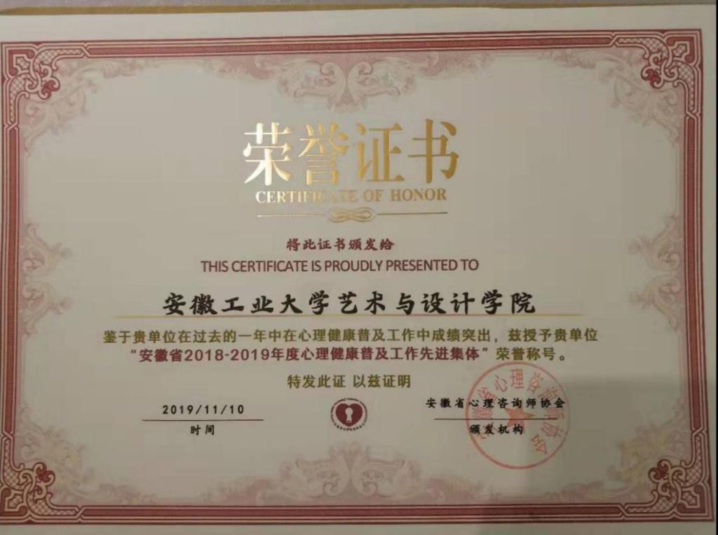 还荣获安徽省2018-2019年度心理健康普及工作先进集体,是全省先进集体中唯一一个院系单位。院心理工作站站长许醴老师也被马鞍山心理学会授予了“心理健康普及先进个人”荣誉称号。今后工作站将再接再厉,进一步加强工作创新,面向全院学生,全方位全角度开展心理健康教育工作。