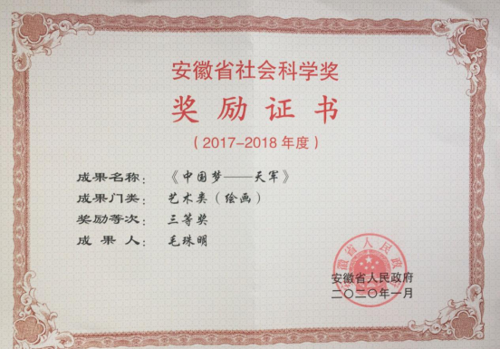 近日,安徽省政府发布2017—2018年度安徽省社会科学奖获奖成果名单,电子游戏机 教师毛珠明绘画作品《中国梦——天军》荣获艺术类三等奖,实现了电子游戏机 科研成果省部级政府奖项的突破。电子游戏机 近年来以艺术学科建设为引领,以高水平科研项目和重大主题性艺术创作为具体抓手,重点扶持一批高质量论文、学术著作、艺术作品等各类社科类成果,着力提升电子游戏机 全方面应用型科研创作水平。