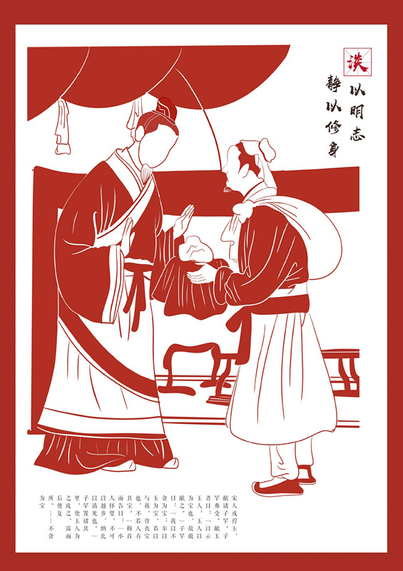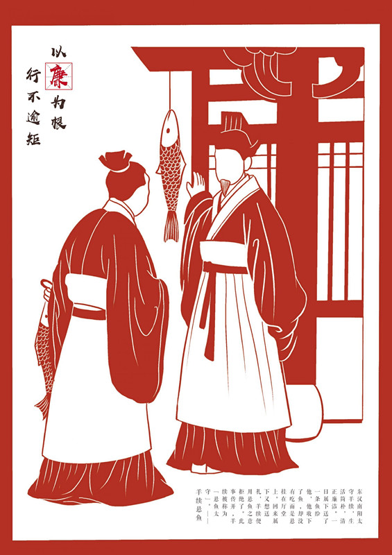 罗子越、张子影同学创作,以廉洁人物故事为主题,采用剪纸效果进行绘制,呈现“不贪为宝”、“羊续悬鱼”两个廉政故事,意指党员干部要遵从本心,不被利益所诱惑。