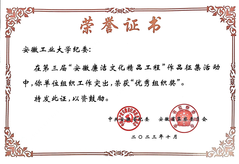 承办第三届 “安徽工业大学廉洁文化精品工程”作品展,共征集852件作品,择优推荐6件作品参加第三届“安徽省廉洁文化精品工程”征集活动。师生以“廉洁自律”为主题,深入挖掘身边的廉洁元素,通过平面设计、视频、书法等多种形式,以极具生命力的艺术语言诠释对“清廉”的理解,营造崇廉拒腐的校园风尚。