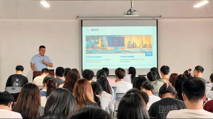 随后,闫飞律师结合自身丰富的实务经验,为在场师生带来了一场内容翔实、案例生动的精彩分享。他首先通过一系列真实案例,深入浅出地阐释了版权保护的核心价值与具体应用。接着,他系统介绍了外观设计专利、著作权、商标等知识产权形式的基本概念与法律框架,并结合动漫、文创等学生熟悉的领域,具体分析了作品创作、品牌运营中的常见风险与维权策略。