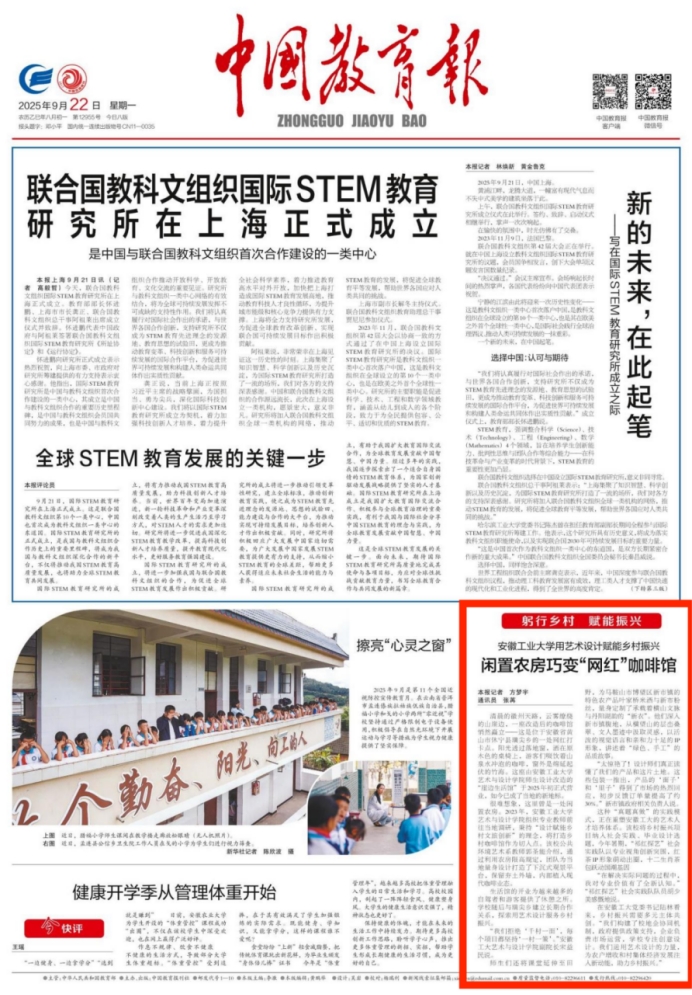 服务乡村振兴的显著成果获得国家级主流媒体高度关注。9月22日,教育部主管的权威媒体《中国教育报》在头版显著位置刊登文章《安徽工业大学用艺术设计赋能乡村振兴 闲置农房巧变“网红”咖啡馆》,深度报道了电子游戏机