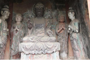 同学们第一站来到麦积山,被麦积山石窟的生动艺术深深吸引,感受到泥塑艺术的精湛,强烈的民族意识和世俗化的趋向,体现了外来艺术本土化的过程。麦积山的塑像始建于(384年―417年),大兴于北魏明元帝、太武帝时,孝文帝太和元年(477年)后又有所发展。这里的泥塑大致可以分为突出墙面的高浮塑、完全离开墙面的圆塑,粘贴在墙面上的模制影塑和壁塑四类,反映了中国泥塑艺术的发展和演变过程。