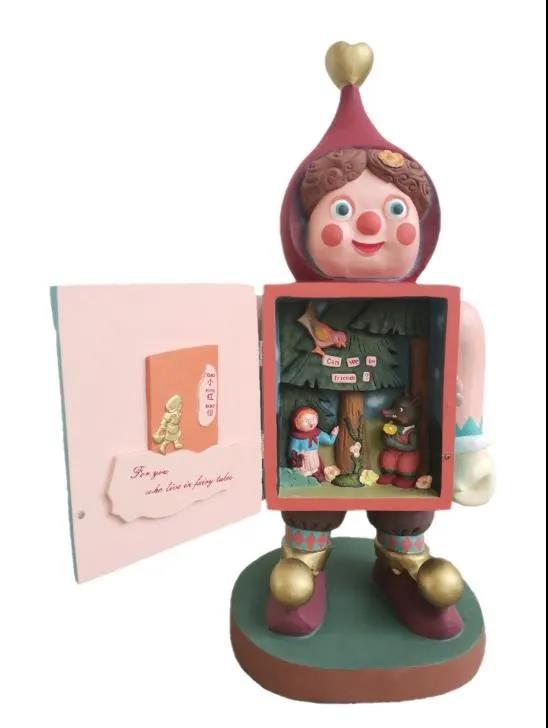 设计说明:童话的世界既能够让人们感受到世间的温暖与爱,也能够让人们看清世间阴险丑恶的一面。作品采用木雕和机械装置相结合的创作手法,还原出小红帽与大灰狼在森林深处相遇交流的场景,表面上看起来十分的温馨美好,实则危机正在暗中降临。