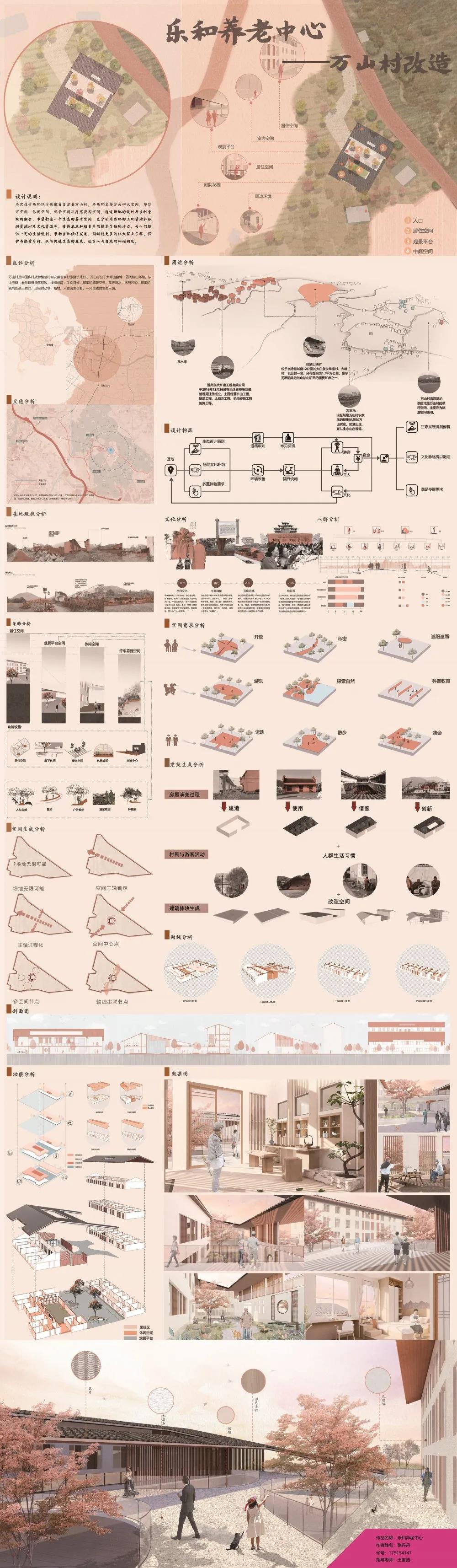 设计说明:设计场地位于安徽当涂县万山村。场地分为四大空间,即居住空间、休闲空间、观景空间和疗愈花园空间,希望创造一个生态养老空间,充分利用当地的包括物质资源和非物质资源在内的土地、文化等资源。更加增强场地的活力,为人们的生活提供一定的便利,带动当地经济发展,同时让每个人了解、保护和爱护乡村,从而促进生态发展,同时也培育人与自然的和谐。
