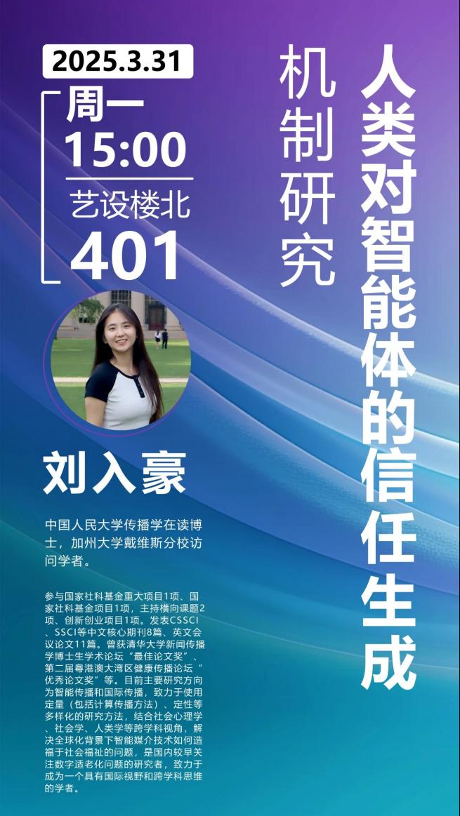 刘入豪,中国人民大学传播学在读博士,加州大学戴维斯分校访问学者。参与国家社科基金重大项目1项、国家社科基金项目1项,主持横向课题2项、创新创业项目1项。发表CSSCI、SSCI等中文核心期刊8篇、英文会议论文11篇。